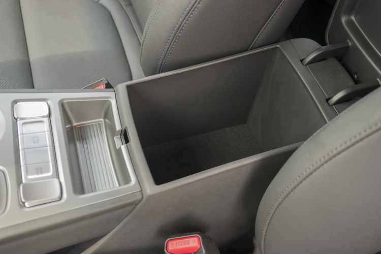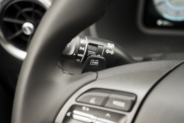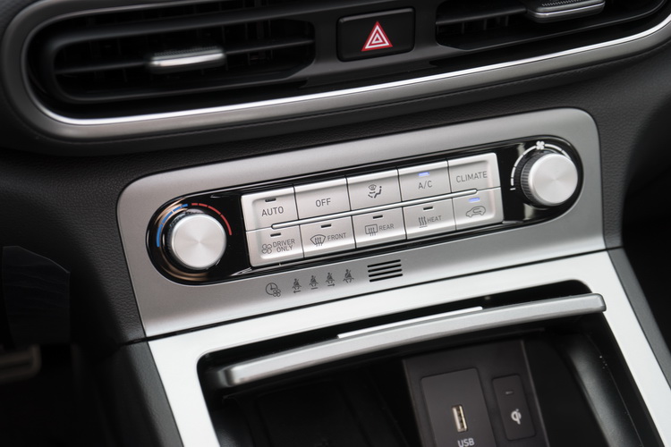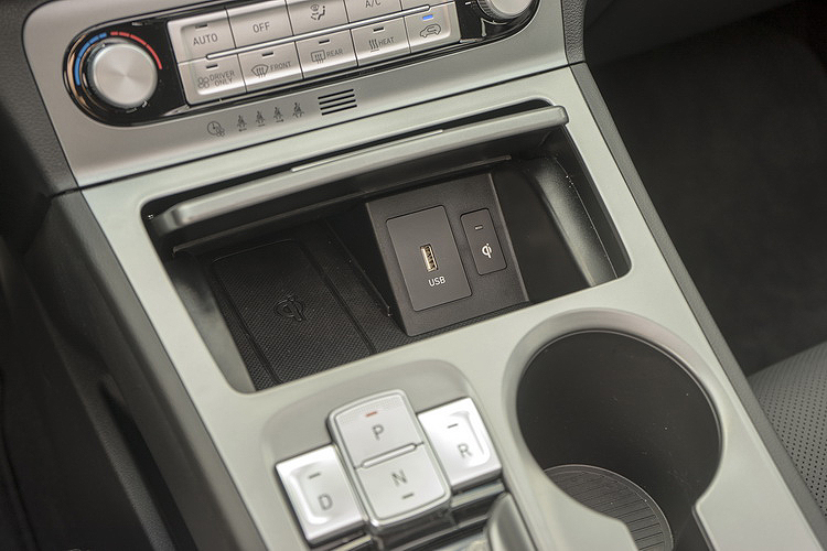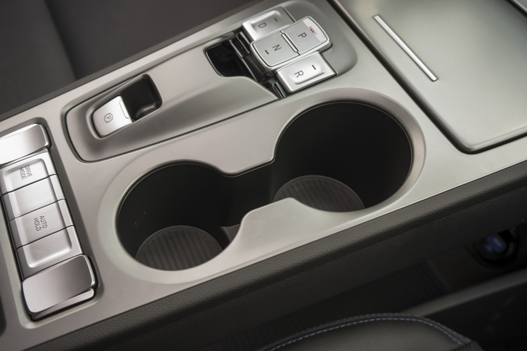 前面提過,車廠對Kona Electric的定位就是單純的車系中搭載電力驅動系統的車型,所以在內裝也是沿襲車系的基本設計,只在中控台/中央鞍座部分做了一些調整並採用軟質塑料與類金屬飾板。中央鞍座最大的變化就是以檔位切換按鈕來取代原本的排檔座,也因而可以在旁邊挪出空間配置兩個口徑不小的飲料座。其後方則是駕駛模式切換按鈕與斜坡起步煞車輔助按鈕。