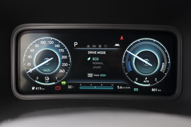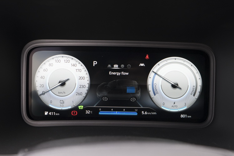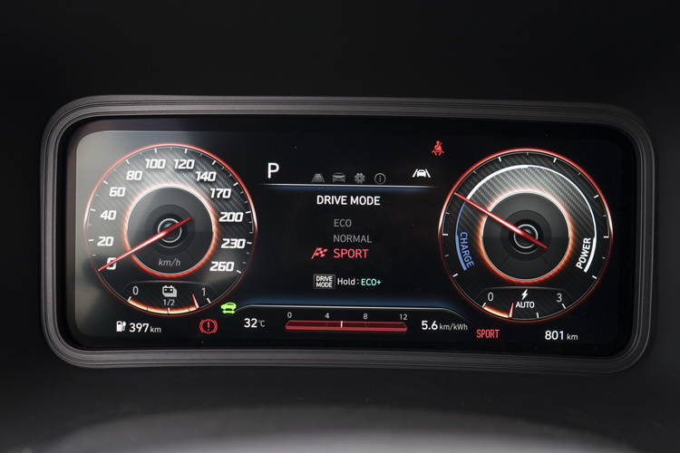 駕駛座前方配置10.25吋全數位顯示幕來顯示雙圓儀錶以及其他相關行車資訊,也包括了電能傳輸的圖示、電能殘量、尚可行駛里程、瞬間耗能、平均耗能等資訊也一覽無遺。右邊的電力輸出/充電狀態顯示儀錶下方還有煞車動能回生程度的顯示,三段滿格代表最大回生程度(市區或走走停停的行駛不建議,適合用於中高速行駛),也就是當你收加速踏板時車子會有最大的制動阻力。在不同的駕駛模式下儀錶也會有不同的顯示風格/色彩。