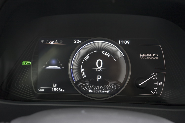 UX 300e在車系中的定位是頂規車型,所以配備最為豐富。駕駛者前方的七吋高解析液晶儀錶顯示幕因應電動車屬性右上方的水溫錶取消改放「LEXUS UX 300e」字樣,下方的油錶則改為電量錶,不過同樣是採類比指針的形式而非殘電量百分比的數位顯示方式,看起來跟油錶沒啥不同。中央的轉速錶改為電量輸出/電量回充的狀態顯示。