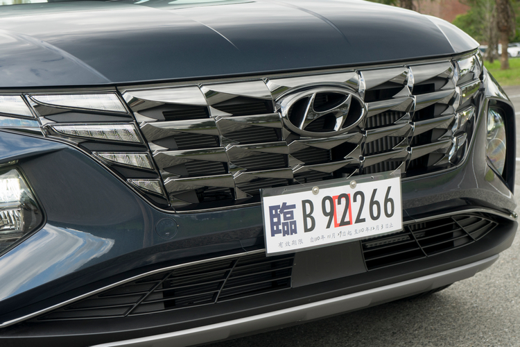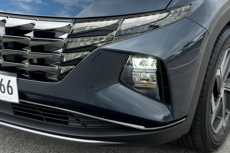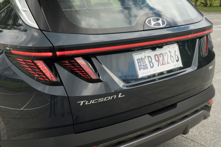 與前代相較,新Tucson L外觀給人更犀利、更有科技感的印象。車頭水箱罩採黑化鍍鉻(鎳鉻)處理,且與隱藏式投射的日行燈融合成為整體的造型,內部像是鑽石的表面眾多的多邊體結構,也讓日行燈顯得相當有特色。LED頭燈組則是採分離式設計,試駕中也發現轉向輔助燈的反應快且亮度明顯,在夜間轉向時能確保轉向方向的視野。