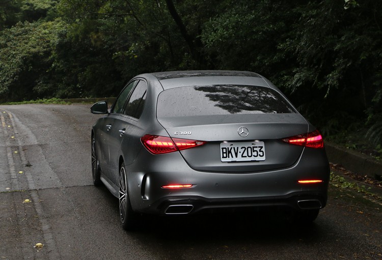 C300標配就有AMG line的內、外觀套件,所以搭配的是19吋AMG輪圈,保桿的進氣口、飾條設計和裝飾性尾管都和C200或C180看起來不一樣,而且還有運動化的引擎聲浪調校。試駕車特別選用夜色套件,在一些細節上應用了黑色主題的飾板,後窗也更換為深色玻璃。