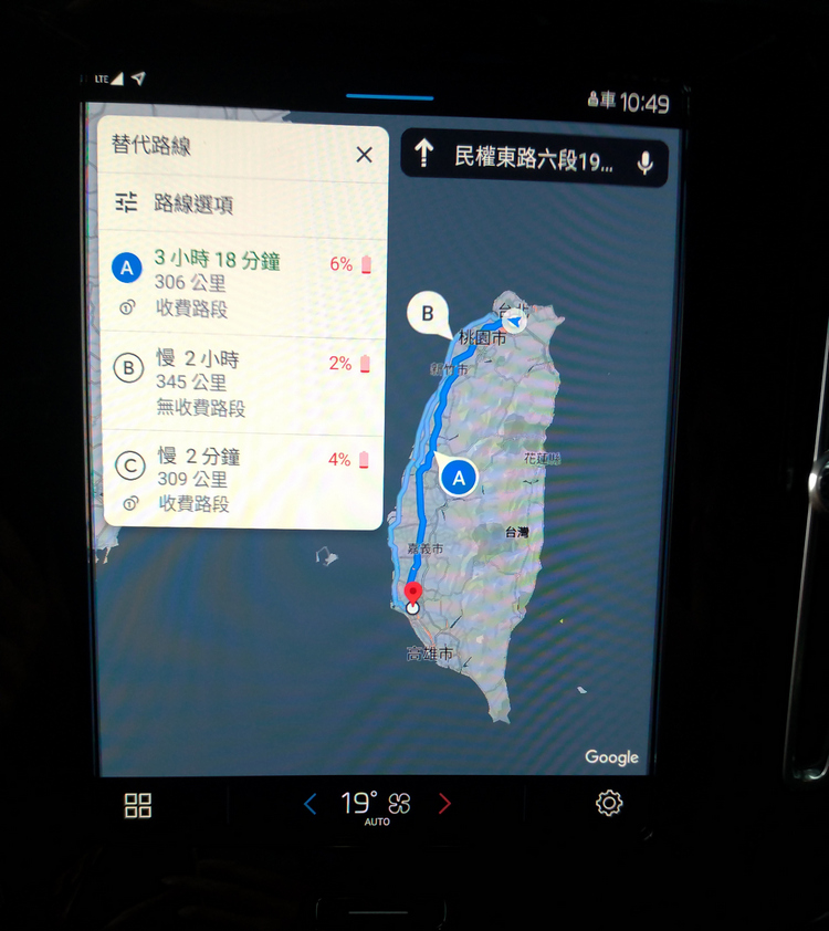 電池部分搭載由27個串聯電池模組(每個模組由12個電池芯組成)所構成的鋰電池,在配置上也避開了置腳的位置,後座乘客的腿因此不會被抬高而影響舒適。電池的蓄電容量為78kWh,在WLTP測試規範下的續航里程數據是418km。 因為續航里程是400km等級,車廠也特別安排了從台北至台南的試駕行程。從民權大橋旁的新凱展間規劃至台南桂田酒店約3小時18分鐘的路程Google Map預估到達時電量會只剩6%。不過我們當然不會就這樣直奔飯店,先順順開不頻繁超車的狀態下來到台中並到審計新村與中央公園拍照後再去台中公益路上的上立汽車充電,此時從飽電狀態用到剩下44%。經過半小時的DC快充後來到82%。再以頻頻大腳油門的方式花一個半小時左右開到台南桂田,此時電量剩下36%。