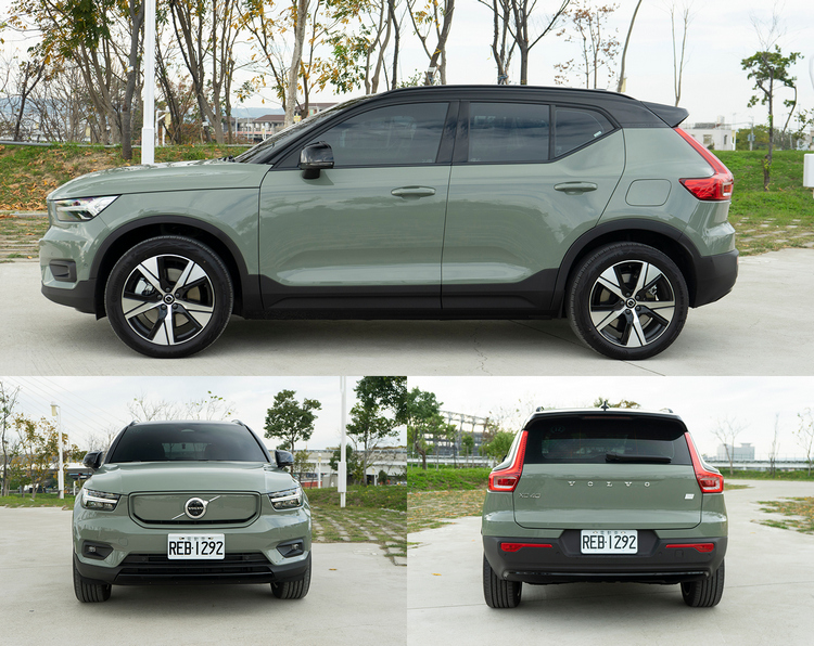 XC40 Recharge與汽油車型外觀上的差別,先從車身尺碼來看,車身軸距與車身長寬都是一樣,但1647mm的車高則比汽油車型的1658mm略低一些,比較明顯的差異則是在車身距地高度部分Recharge的176mm要比汽油車型的211mm降低了達35mm,對於降低車身重心提升操控表現及風阻等方面都有好處。 車頭「水箱罩」的位置因為電動車的散熱需求不高所以放上一片空氣力學飾板以利高速時降低風阻,只留下了一點空間來進氣散熱。在亮黑色車頂後方C柱處可以看到「Recharge」字樣(雖然有些低調不明顯,路過的人車應該沒法一眼就察覺),車尾也有專屬銘牌來表明其P8頂規(雙馬達)高性能電動車的身分。