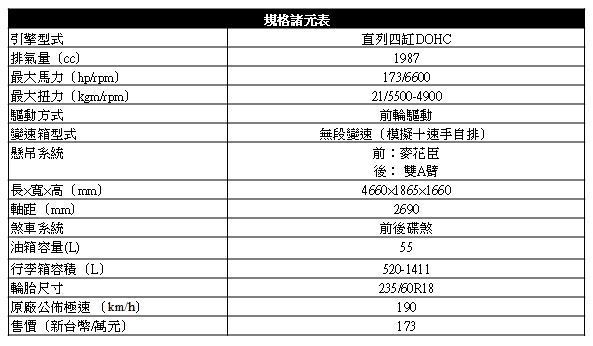在兼顧油耗排汙表現下,這具2.0升引擎仍有不錯的173hp/21.0kgm動力數據。