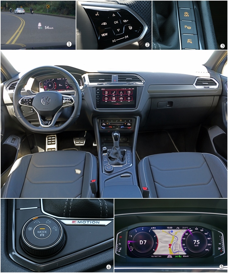 ▲(1)Tiguan Allspace中階以上車型都標配HUD抬頭顯示器。(2)這款車的多功能方向盤也是車系唯一採用觸控式操作的設定。(3)完整豐富的主被動安全防護機制,是家用休旅車不可或缺的元素。(4)透過駕駛模式選擇旋鈕,可在公路、越野模式之間切換。(5)全邏輯數位化儀錶無論功能性或辨識度表現都有一流水準。