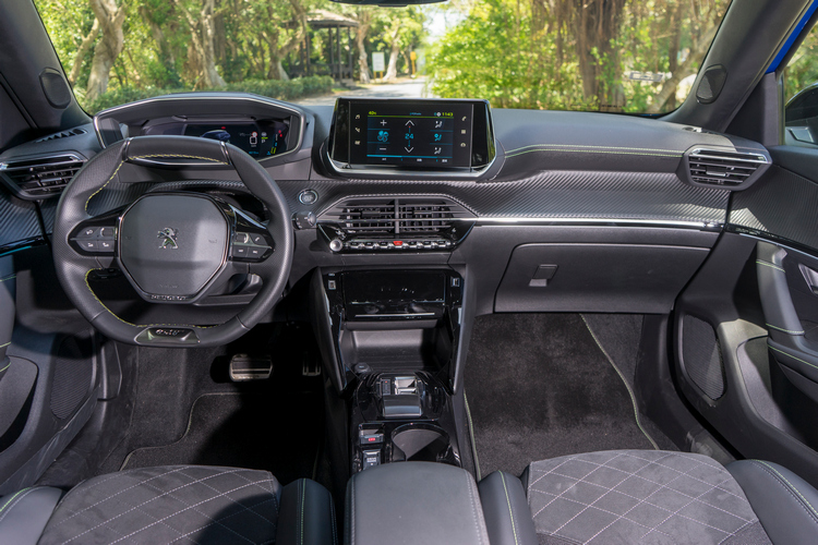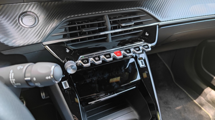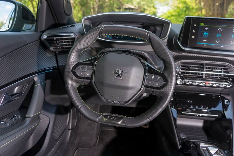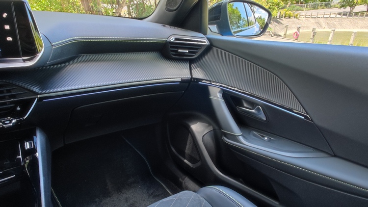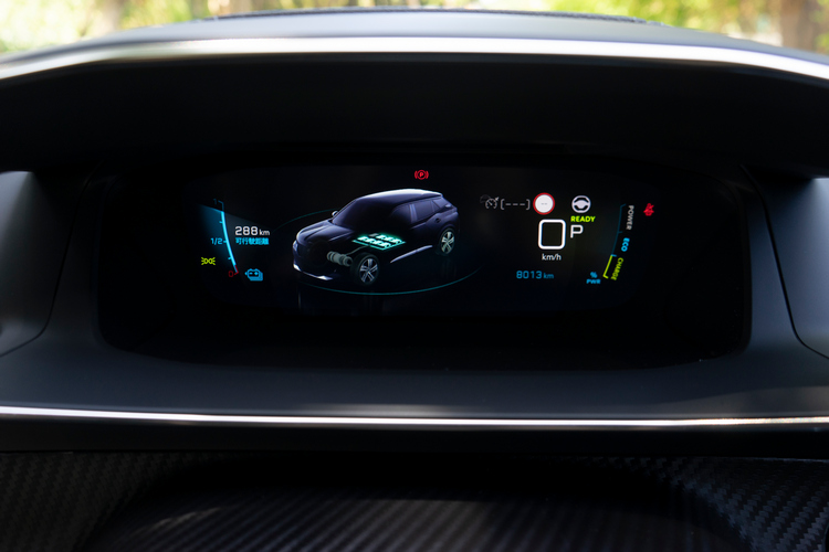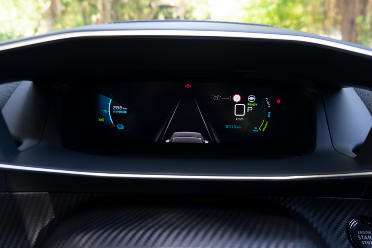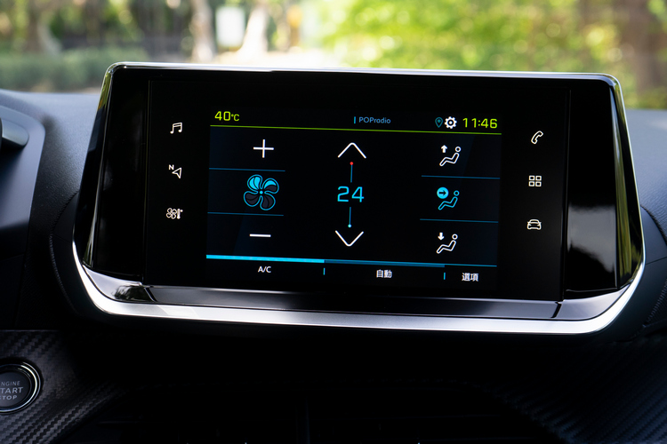 跟外觀一樣,e-2008車內的i-Cockpit駕駛導向座艙設計與引擎車型大致上都是相同的。所以你可以看到小盤徑且上下緣都是平底的的皮革包覆多功能方向盤,可以操作電話、語音助理、音量調節、儀錶顯示模式、選曲/切換電台、廣播電台搜尋與音源切換等功能。