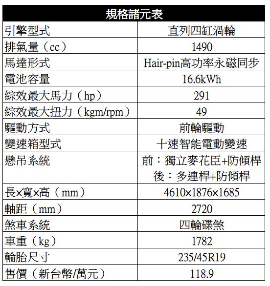 HS PHEV搭載的插電式油電動力系統是由1.5升汽油渦輪引擎與配置於前軸的馬達所組成。其中電動馬達的最大馬力為11hp、最大扭力為230Nm。系統的綜效最大馬力為291hp、最大綜效扭力49kgm。所搭載的鋰電池(寧德時代)容量為16.6kWh。值得注意的是與不少PHEV車在馬達部分是採用單速變速系統不同,HS PHEV的變速系統馬達是與具有四個固定齒比連結,而引擎則是與單離合器六速手自排固定齒比連結,透過電動來將引擎的六齒比去與馬達的四齒比去做出最佳的搭配組合來傳輸扭力(具體為九前速+1倒退檔位)。 ![]() ▲搭載的PHEV系統由1.5T渦輪引擎搭配122kW輸出電動馬達所組成。![]() ▲引擎與馬達各自與六速及四速固定齒比變速機構連結,由電腦切換操作檔位的搭配。話說回來,綜效馬力、扭力數據很漂亮、甚至是已經等如性能車般的嚇人(對照其118.9萬的價格來說),但實際開起來加速並沒有如預期般的那麼衝、那麼猛爆,只能說加速感很順(與1.5T車型相比差別是有感的),並且在爬坡、中高速行駛時的再加速等情境車子都能適時交出加速力道來應對。由於是靠電腦去搭配引擎與馬達的檔位,所以並不提供手動升降檔位功能,也沒有多重駕駛模式以及方向盤上的「Super Sport」按鈕,但輸出的反應算快且聰明。 ![]() ▲雖然實際開起來的性能感與規格數據有段距離,但動力銜接與反應要比1.5T車型好很多。![]() ▲全螢幕數位儀錶的馬達資訊細到電流、電壓、轉速等。![]() ▲10.1吋中控台螢幕對電量、純電續航力等資訊都明確顯示。![]() ▲在智慧充電模式中選擇高電量可讓引擎及早為電池充電保持較多電量。![]() ▲PHEV車幾乎都有的能源流向顯示畫面自然也少不了。雖說PHEV車型在懸吊上與1.5 T車型同樣是前:獨立麥花臣+防傾桿、後:多連桿+防傾桿結構,不過在多了電動馬達系統與後座下方的電池之下車重多了二百多公斤,反而在行路性上給人更多的穩定感,不像1.5 T那般地略飄且車身的上下方向晃動較多。操駕起來更覺舒服且動態穩定好掌握。可說是PHEV系統對於「操控」提供的額外效果。當然,車廠對於車身前後配重也是有下功夫去處理的。 ![]() ▲鋁圈為19吋雙色戰斧造型。![]() ▲換檔全由電腦控制,所以沒有「Super Sport」模式按鈕。![]() ▲車道保持輔助可單獨設定開啟,在60km/h以上車速無須開啟ACC就會啟動。![]() ▲在ACC等駕駛輔助系統運作時會切換至運作畫面讓駕駛者更易掌握。