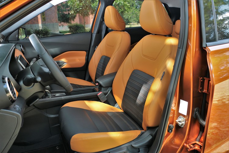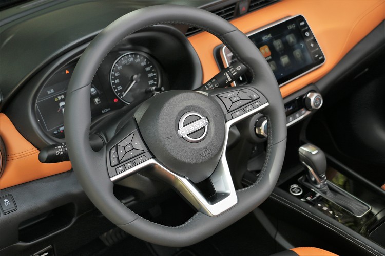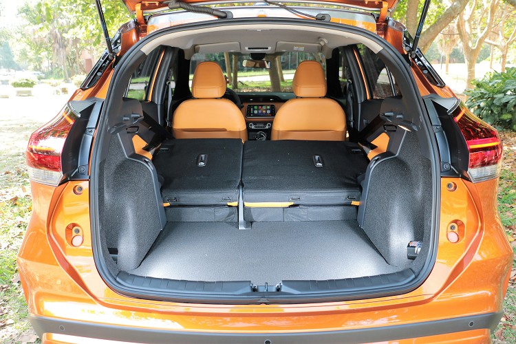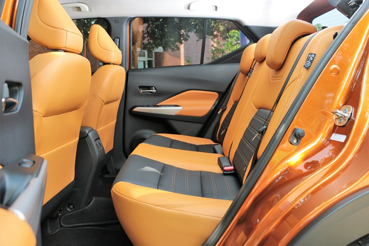 車內有黑色單色或者橘、黑雙色配置。座椅使用Nissan最自豪的3D紓壓座椅,能緩解長時間駕車時的疲勞感。軸距達到2620mm的Kicks,後座空間不算寬裕卻也沒壓迫感;後座沒有冷氣出風口但有貼心的USB充電孔,椅背角度無法調整影響舒適性。行李廂空間有428公升,取消了底板收納功能,所以後座椅背傾倒後,銜接處會有很大落差,後座椅背6/4分離傾倒後能達到910公升。