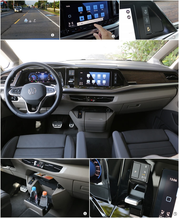 ▲(1)Style車型標配投影式HUD抬頭顯示器,提供直覺快速的駕駛新體驗。(2)為了塑造先進科技形象,座艙大量使用觸控操作面板取代傳統旋鈕或按鍵。(3)左右車側都配備電動滑門,並有遙控開關的設計。(4)為了節省空間,置杯座為活動式設計,同時上方還提供了無線充電座和雙USB-C充電孔。(5)電子線傳式換檔裝置位在中控台,同時還整合按鍵式電子手煞車。