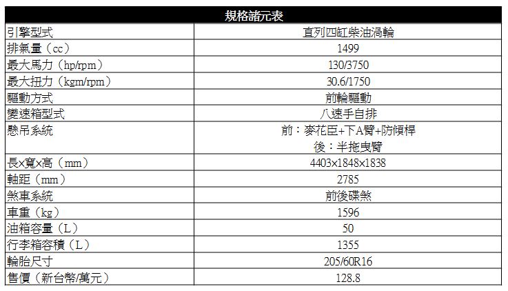 車室內裝及控台介面布局與標準軸距車型也是完全相同,控台在視覺上會讓人感覺緊湊一些,中控台有明顯面向駕駛者的角度,在觀看直立式八吋全彩觸控螢幕時比較易閱讀、不容易受反光干擾,不過空調出風口對著駕駛者直吹就...(夏天貪涼的人應該會很高興)。八吋中控螢幕的畫面與圖形與之前試的標準軸距車型相同,也支援有線連結智慧手機的Apple Carplay與Android Auto整合平台。