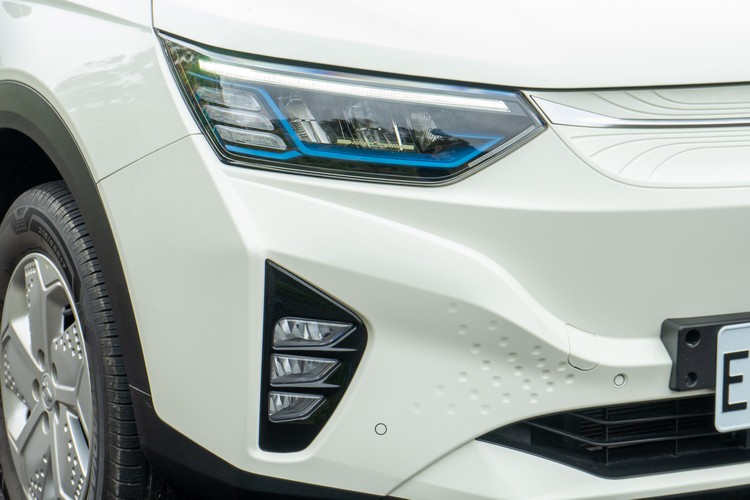 首先是車頭部分,原本的水箱罩處換上了飛浪式護板,不只是做出差異化也對空氣動力有實際幫助,減少車頭空阻。車上一些造型細節以鯊魚為意象,例如前保桿的魚鱗紋路、車側的呈現水流劃過之感的多道造型折線以及同樣有著魚鱗紋,同時注重空力減少空阻的17吋鋁圈,粗壯的設計對於較重的的電動車車身也較能支撐。