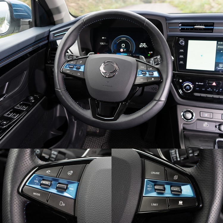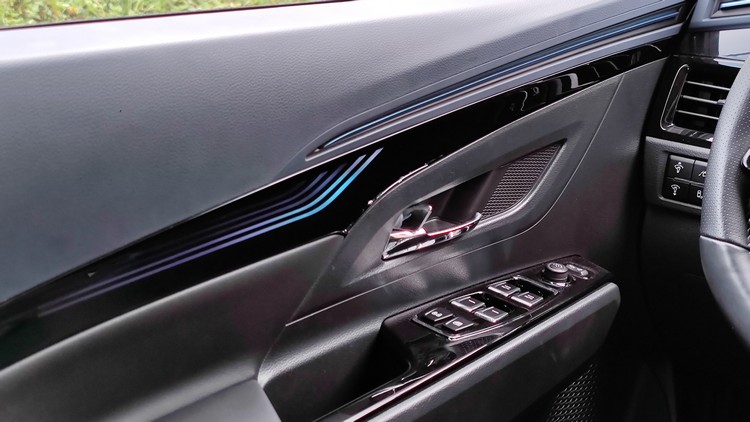 車系旗艦規格的配備車內前方控台駕駛介面的布局與燃油車型大致相同,在控台飾條與方向盤上都加入藍色元素來呼應外觀,方向盤前方的12.3吋數位儀錶比汽、柴油引擎旗艦車型所搭載的10.25吋儀錶大上一些,且畫面設計也大不相同,採用中央單環來顯示車輛行駛中的耗電/動能回生充電、車速、電量百分比、檔位等。兩側則是依時機顯示各項車內功能與駕駛輔助功能,甚至是停車時輪胎沒有回正都會跳出通知提醒你。
