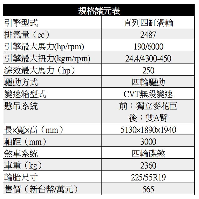 動力上,這次試駕的350h四人座車型與上代的300h雖然同樣搭載由2.5升 Atkinson 循環四缸自然進氣引擎與前、後各一具馬達所構成的油電動力系統搭配ECVT無段變速系統,不過引擎最大扭力提升至24.4kgm/4300-4500rpm,系統綜效最大馬力則提升至250hp,比上代的163hp要進步許多,