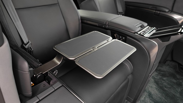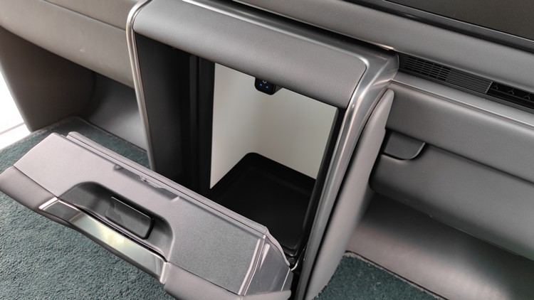 而在電子玻璃的下方則配備了48吋的影音螢幕,除了全螢幕顯示影音內容,也可以將螢幕切割成兩個24吋畫面讓左右後座乘客分別觀賞自己喜愛影片;或是你不需要48吋的大畫面,只想用24吋畫面輕鬆觀看都沒問題。影音是透過HDMI端子連結,意謂著你要自己準備影音播放設備,如果直接配備本身有Android系統之類的螢幕想看影音內容時應該會更加方便。48吋螢幕下方則在中央有個小冰箱,兩側也有額外的收納空間。