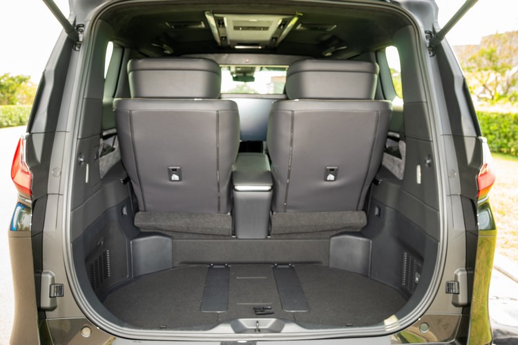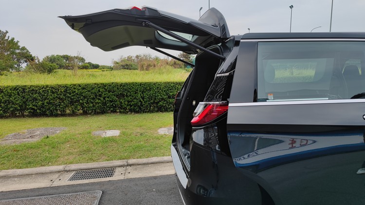 後座空間不用說,將六/七人座的兩排座空間提供給僅兩人乘坐,連身體躺平伸直都沒什麼問題自然是十分頭等艙等級的寬敞。而在後座椅椅背是正常直立狀態下,後方的行李廂空間可以橫放四組9.5吋高爾夫球具或是兩組28吋+兩組20吋行李箱。