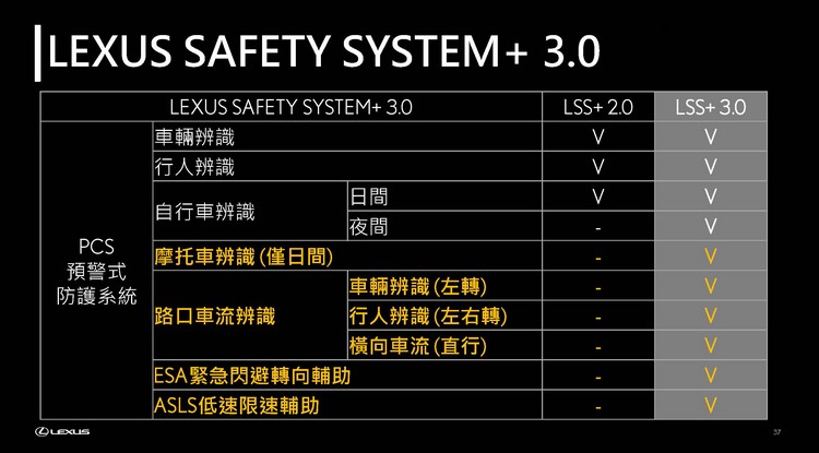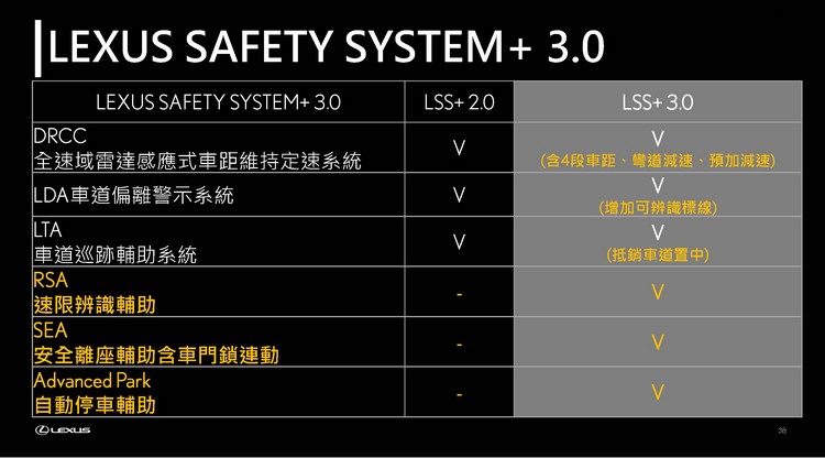 安全性與駕駛輔助上,新LM搭載了Lexus Safety System+ 3.0先進駕駛輔助科技,除了將LSS+ 2.0原有技術功能提升加強外,更增加了不少新的項目,如下面表格所列。