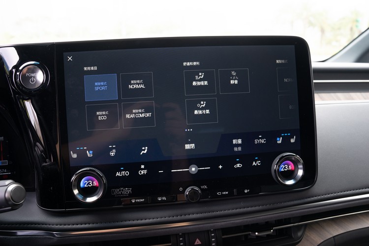 系統提供Normal、Eco、Sport、Rear Comfort與車主自訂設定的Custom模式。在Sport模式下油門反應會稍快一些,方向盤轉動手感也略重一點,但並不會太去影響到行路的舒適感(畢竟身為豪華廂旅舒適性還是首重),反而是在遇到路面起伏時車身上下方向的晃動減小不少較令我們印象深刻。而所謂的「Rear Comfort」模式則是透過讓動力輸出、驅動力與煞車的控制,讓車身在行車時維持水平,減少後座的晃動以及減少車頭在加速與煞車時產生的抬頭與下潛動作,讓後座乘客能持續維持舒適的乘坐感。