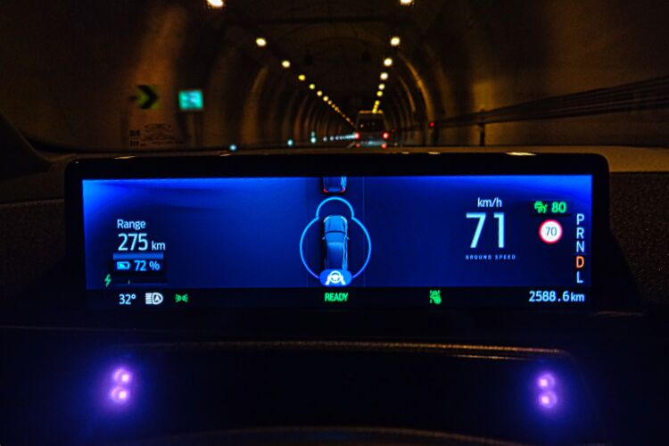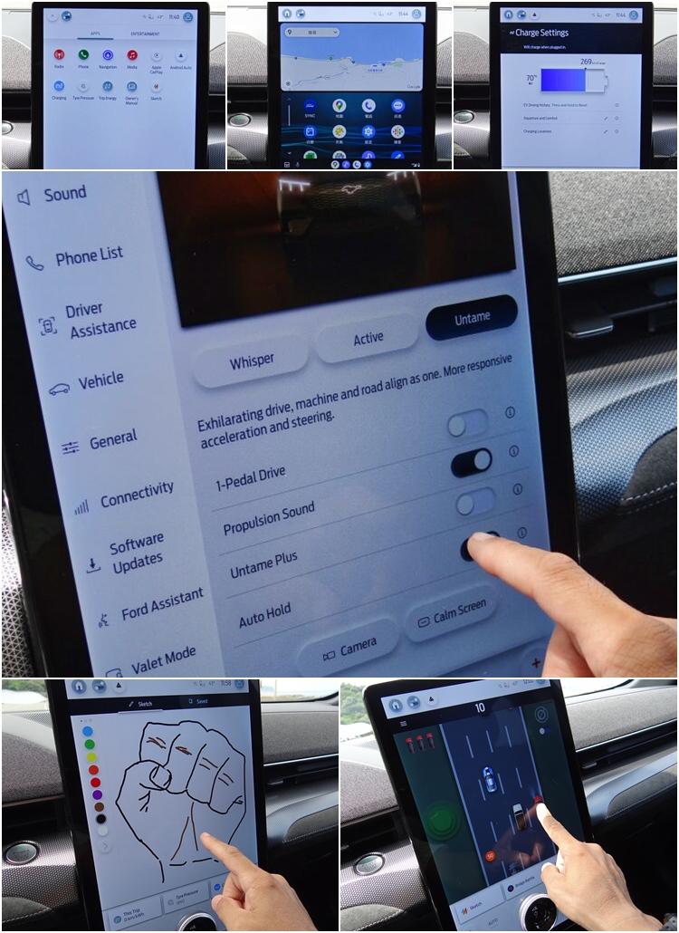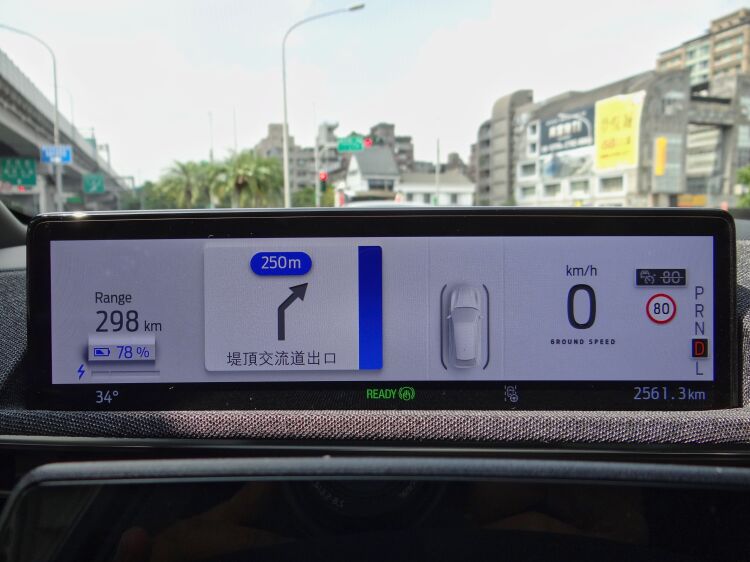 主顯示區則是內建導航系統和多媒體系統,並能顯示剩餘里程、電量、導航指引、駕駛輔助系統等資訊,以及操作自動停車、無線Apple CarPlay/無線Android Auto手機連結,甚至還提供塗鴉功能和幾個小遊戲,讓車主在等待電池充電時用來殺時間。比較可惜的是,試駕車因為是驗證車,暫時沒有安裝中文介面,導航系統也缺乏台灣圖資,業者則是保證正式交車時的銷售版本,這些全都將會全數裝回去。