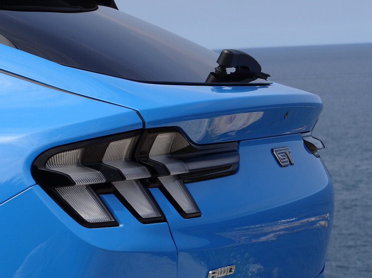 Mustang家族外觀一向都是以野馬圖騰取代Ford廠徽,Mustang Mach-E也是如此,不過在Mustang Mach-E GT的車尾,只能看到「GT」的標誌和AWD字樣,沒有任何品牌或車型的標示,對這款車比較陌生的人,大概只能從三柱形尾燈猜出它與野馬之間的血緣關係。