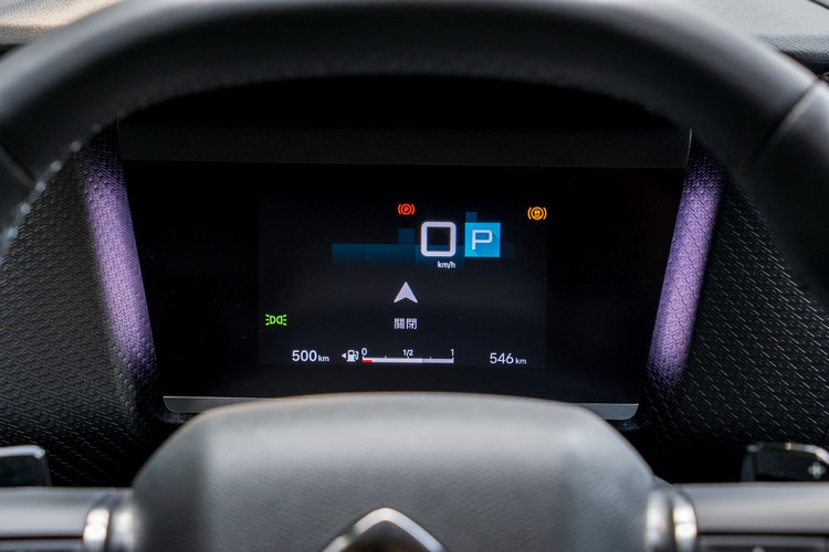 前方控台的造型是簡單而傳統的水平對稱形式,再透過一造型切線的勾勒與包括中控螢幕、數位儀錶螢幕、空調出風口等的不規則矩形輪廓來增添一些設計感。駕駛座前方是尺寸小巧的5.5吋數位儀錶顯示幕,儀錶尺寸小所以畫面的呈現也簡潔舒適為主,且是以繁體中文顯示。顯示的資訊項目雖然少些,但其實重要的行車資訊以簡單易讀的方式呈現閱讀起來倒也舒服。無邊框設計加上兩側間接照明的裝飾在低光照狀態(夜間、隧道)下也別有氣氛。