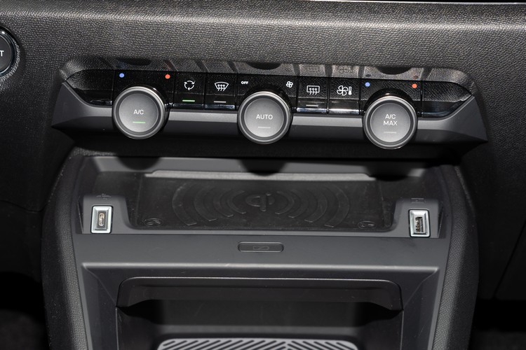 ▲實體雙區恆溫空調介面的質感與觸感不錯,下方為手機無線充電板並有USB-A與USB-C插孔