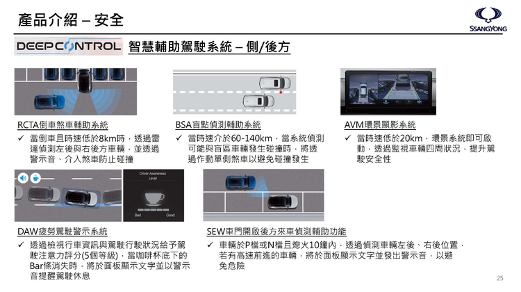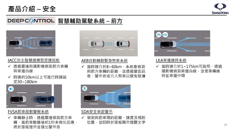 ![]() ▲撇除越野品牌,再國內中大型SUV上要看到這個電子旋紐式加力箱已不容易了![]() ▲除了Normal與Sport模式外,Winter模式則是考量國外雪地行駛環境所提供的設定新Rexton在安全上擁有豐富的主被動安全配備,包括全車九氣囊、EPS、HSA、HDC、TSC、雙前座預縮式安全帶、電子式手煞車、Auto Hold自動駐車功能等,就不一一列出。而在駕駛輔助上,所搭載的SSANG YONG「DEEP CONTROL」智慧輔助駕駛系統也包含了一般常見的輔助系統項目(請見下圖)。