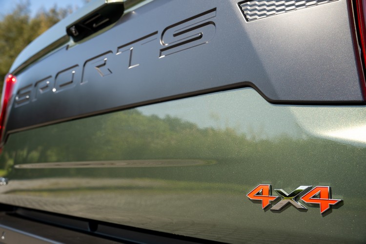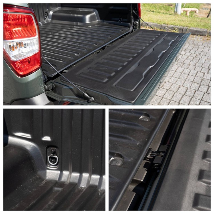 車側對後車門採取了全覆蓋式設計,避免將泥土粉塵帶入車室。從車側轉折跨至車尾的尾燈很有立體感,尾燈、後霧燈與轉向燈皆為LED,轉向燈在不同功能狀態下也會以不同顏色來顯示(琥珀色為轉向/煞車,白色為倒車)。具上鎖功能的貨斗尾門為下開式,因為新年式加入了省力裝置所以開關相當輕鬆,且就算是開啟後直接放手尾門在下掉的過程也會有緩衝動作。尾門內部則有強化支撐柱來提高承重與耐用性。