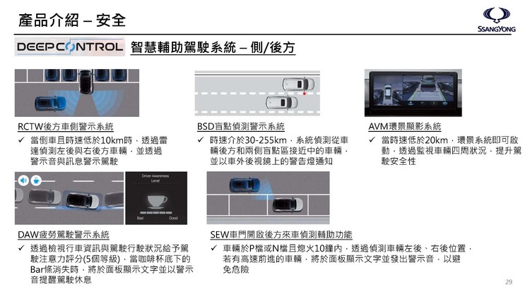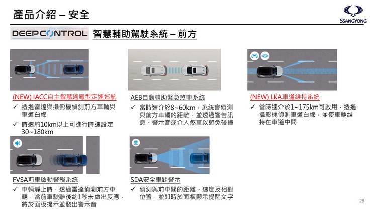 安全性上Rexton Sports也幾乎是比照Rexton,除了全車六氣囊在內的主被動安全配備外,所搭載的DEEP CONTROL智慧輔助駕駛系統也提供多項輔助,包含IACC自主智慧適應型定速巡航與LKA車道維持系統等(詳細說明請見下圖),跟得上現在市場對於安全性與駕駛輔助上的高要求。另外,它也配備窗戶遠端啟閉功能,即使引擎未啟動,只要在鑰匙遙控可控的距離內都可遙控啟閉窗戶。而當車主帶著鑰匙離開車輛2-6公尺左右且車門關閉情況下車輛就會自動上鎖。