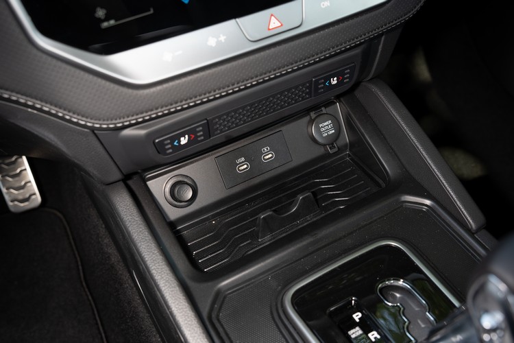 中控螢幕下方的雙區恆溫空調系統介面改為觸控按鈕,增添一點3C科技感。下方的智慧手機無線充電板上有2個USB-C插孔;方向盤具四向調整功能,更能讓車主找到適當的駕姿。另外,跟不少皮卡貨車一樣,在A、B柱上都設有把手方便乘客上下車(特別是越野環境、有傾斜角度之類的狀況)。
