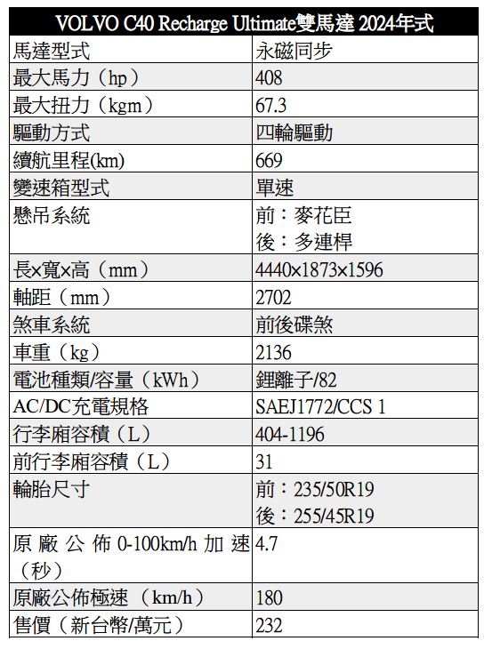 2024年式XC40與C40 Recharge P8在內外裝配置上都與2023年式相同,但在動力系統上這次所試駕的雙馬達車型將原本78kWh容量的電池換為82kWh容量電池,車廠公布的單次充飽電最大續航里程為623公里;對DC快充功率的支援從原本的135kW提升至200kW,在此充電功率下將電池從10%充至80%電量只需要28分鐘,對於消除車主的里程焦慮應該有不小幫助。前後軸所搭載的馬達分別可輸出110kW與190kW,系統綜效最大馬力與扭力維持在408hp與670Nm。