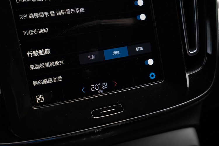 過去我們試駕舊年式車款時曾經提過XC40與C40 Recharge P8的煞車動能回生功能不能做分段的程度調整,但有收加速踏板時制動力很強的單踏板駕駛功能讓車主在一般情形下可以透過只操作加速踏板來駕駛車輛。而新年式車款有一個值得注意的地方,就是在單踏板駕駛功能上除了「開啟」與「關閉」之外增加了一個「自動」選項。在選擇「自動」之下,如果車輛前方近距離沒有車流那麼在收加速踏板時的制動減速力道會略小些,但若前方近距離有車輛或前車速度較慢(例如逐漸減速煞停等紅燈)時收加速踏板時的制動力道就會比較強直至完全煞停。等於是將跟車系統(車距調節定速)的功能去和單踏板駕駛功能去做結合。
