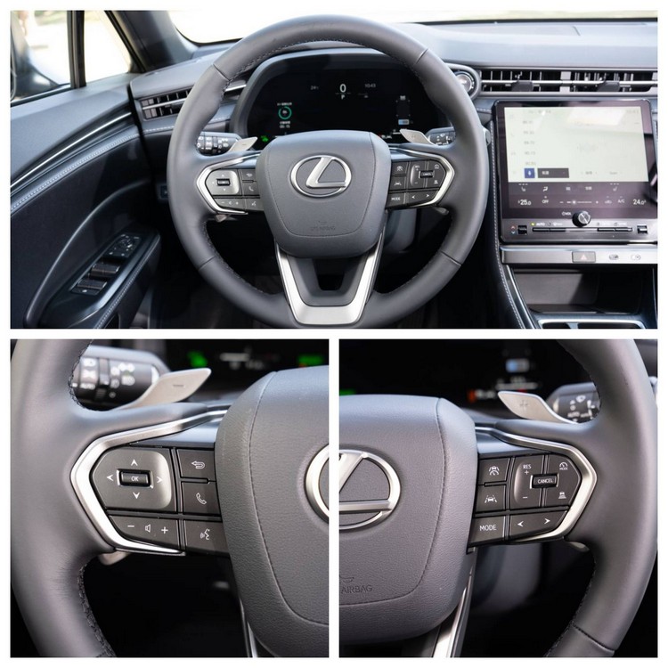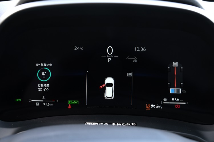 坐進車內,雖然前方控台的設計比較直線條、簡約而中規中矩些(在小車身尺碼之下,這樣能爭取較多空間),但質感表現並不低,甚至與高一階的UX相比都有優越之處,12.3吋的數位儀錶以簡單但不呆板的圖示來呈現多項行車資訊,不過不能與中控螢幕連動顯示導航的小畫面。身為油電車,儀錶右側也提供了能源流動圖,顯示電池電量與馬達是否有在驅動或是處於動能回充狀態。