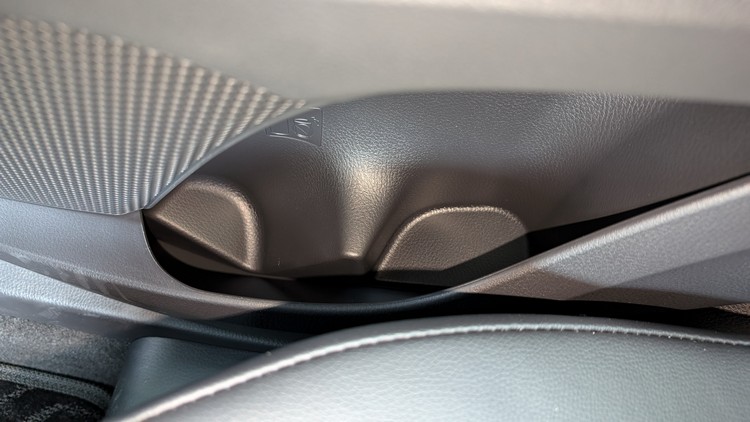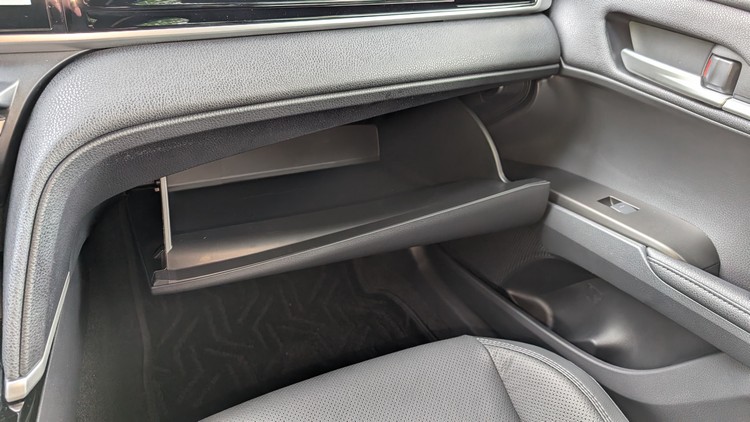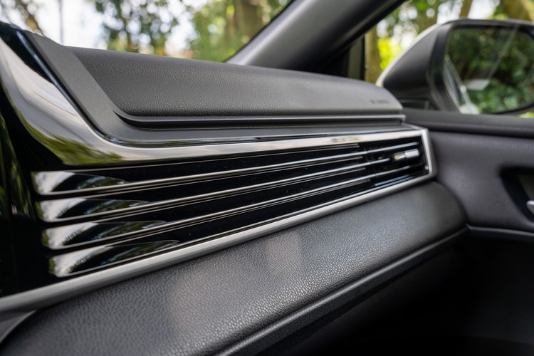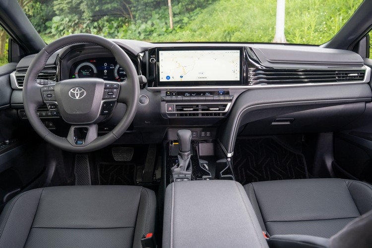 與過去希望藉由不規則幾何形狀的前方控台來營造出高級感的思維不同,新Camry直接大幅簡單化造型,並以大量的水平線條來打造新的前方控台與中央鞍座區域,好處是在視覺感上會比較輕鬆低負擔,也會覺得車室橫向寬度較寬敞,缺點則是設計感、高級感下降,比較難凸顯這部車的自我風格。(自從大面積的中控數位螢幕、儀錶板大舉攻佔各品牌各款新車之後,這種情況就屢見不鮮)。控台上唯一比較「有趣」的部分就是副手座前方的飾板,以吉他弦為靈感的造型不僅帶出更多的水平線條而且還與空調出風口無縫銜接融合。