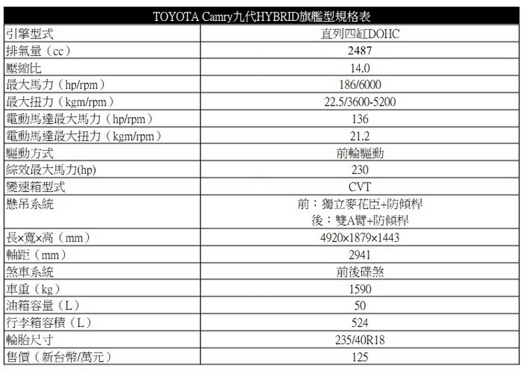 動力上,新Camry有兩種動力選擇,一為沿用自上代的2.0升汽油引擎,可輸出171最大馬力與20.7kg-m最大扭力。而這次所試駕的油電旗艦型則是換上了第五代的2.5 L HYBRID系統,其中2.5升汽油引擎可輸出186hp最大馬力與22.5kg-m最大扭力。搭配專為油電系統設計的E-CVT電子控制式無段變速箱。 ![]() ▲油電動力環上了第五代油電系統,仍然是搭配2.5L引擎但改採鋰電池並換上新PCU,系統綜效最大馬力小升至230hp![]() ▲變速箱維持搭配E-CVT,也提供ECO、NORMAL、SPORT、EV四種駕駛模式