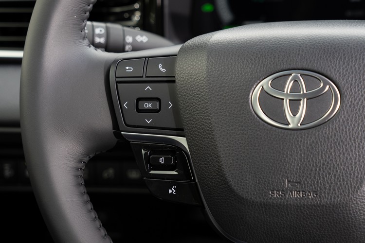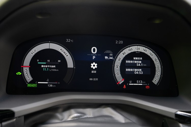 前面提到新Camry的控台造型大幅簡化,為的就是迎接更大面積的數位儀錶與中控台螢幕,試駕的油電旗艦車型配備12.3吋數位儀錶板,除了面積更大可以更清晰地呈現多項資訊外,畫面也有科技感,只可惜不能與導航系統連動提供小的導引畫面。 ![]() ▲12.3吋數位儀錶,畫面主要以圖示線條結合文字資訊,在切換駕駛模式時只會短暫顯示進入該模式畫面儀錶本身色調不變![]() ▲方向盤左右側功能鍵共分為三個區域:主機操控、駕駛輔助與音訊控制