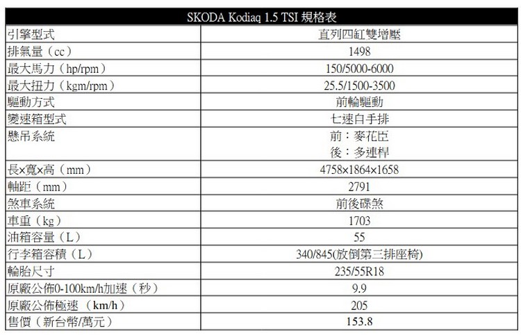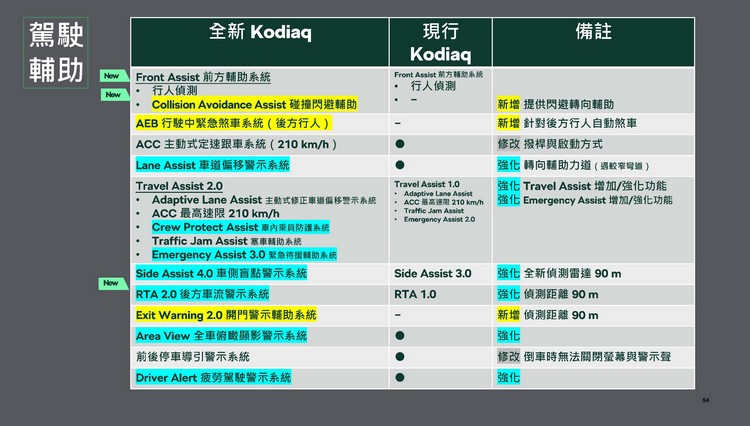 SKODA SUV家族中的老大Kodiaq於去年全球首發第二代車款,今年正式引進國內。新一代的幾個主要產品特色包括車格放大帶來的更多空間、更多的功能性、智慧旋鈕的功能操作便利性與可永續再生的環保內裝材質、安全與輔助系統功能升級強化等。轉用VW集團MQB底盤平台的EVO版本代表著可以搭載插電式油電混合動力系統,不過國內上市初期並不會導入。