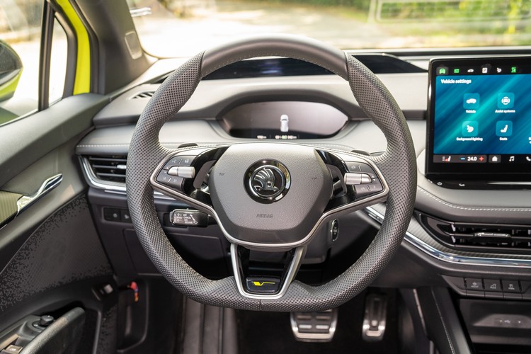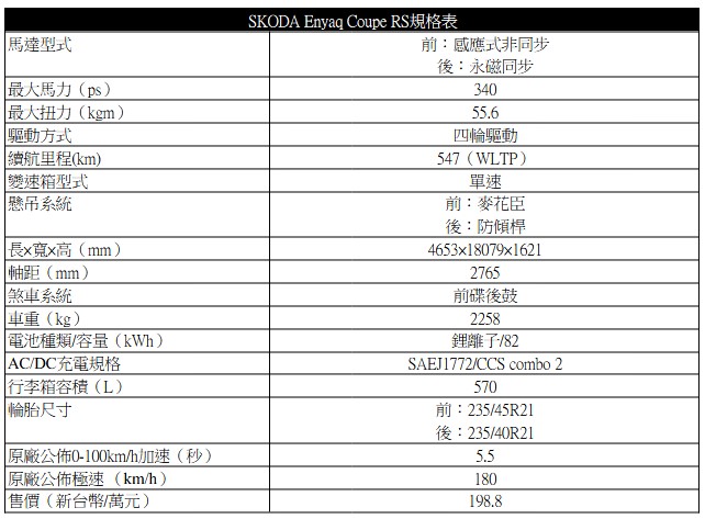 穩定好掌握的操控 但犀利強悍非其特性 身為VOLKSWAGEN集團的一份子,Enyaq Coupe RS同樣採用了集團的MEB電動車專用模組化底盤平台,與Volkswagen ID.4、ID.5、Q4 e-tron等車款都共用此一平台。前:麥花臣、後:多連桿的懸吊結構也是同級中很常見的設定。不過實際操駕起來還是有同中存異的地方。 雖然掛上了RS之名,但在操控與乘坐感上相較於其他品牌車款的性能車型來說都算是相當溫和的。儘管車重破2.2噸,試駕時在一些山路彎道或比較崎嶇的路況下車身動態都有得到很好的控制。車體重量與重心集中在車身下方的感覺明顯,所以在過彎或加減速時重心的移動很好預測掌握。所配的速度感應式方向盤在中低速時的轉動手感就已略偏重,路感回饋則算是普通,還是以讓一般人都能好上手為主的設定。 在溫和易控的操駕與優異的震動噪音抑制之下,Enyaq Coupe RS提供不錯的乘坐舒適性而標配的DCC電子可調懸吊也有很好的表現,試駕時經過幾次大的路面高低落差或坑洞碎石路面,傳到車室內的震動感覺都相當微小。在經過一些不平整的路面時,車輪保有優異的貼地感,車身的跳動感被大幅抑制。在舒適性與運動性的天秤兩端,它明顯是偏向前者。 結語 就200萬左右的帶有Coupe風的電動跨界SUV來說,Enyaq Coupe RS的主要對手有HYUNDAI Ioniq 6、KIA EV6、TESLA Model 3等,或是向上挑戰AUDI Q4 Sportback e-tron、VOLVO C40等豪華品牌車款,即將到來的VW ID.4、ID.5當然也在視野之內。 Enyaq Coupe RS的外觀有型,固定式全景玻璃天窗銜接大片斜背的後擋風玻璃對於「Coupe」美感也有加成襯托之效。車內設計雖沒有什麼大膽或驚人創意,但質感表現不錯,控台介面、 資訊娛樂系統實用性也不差。沒有配備自動停車輔助系統有點小可惜。 動力與操控上雖然不是「十分駕駛取向」的高性能車款,跟過去SKODA 「RS」家族其他車款差不多,只能算是「跑德比較快的」Enyaq,但若以同價位來看其實表現並不差(只輸TESLA的Model 3 Long Range比較多些),很多對手車款都有性能更誇張的真正「高性能」車型但售價都得再加個幾十萬元。所以若是比較速度、熱血駕馭的話可得再多追加些預算。 Enyaq Coupe RS在各方面表現算是務實而均衡,但在競爭對手也都各有強項或特色之下Enyaq Coupe RS要在兩百萬價位電車級距中脫穎而出這挑戰也不會輕鬆。