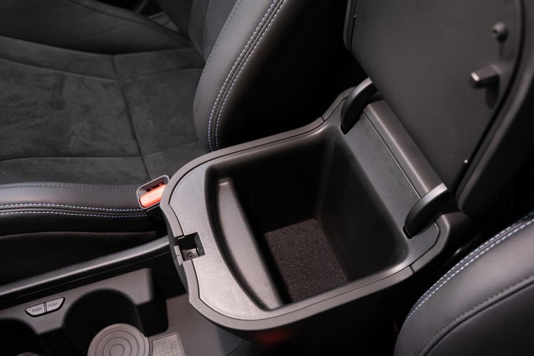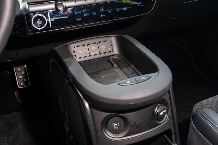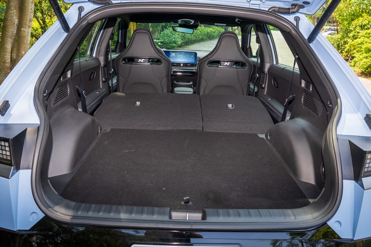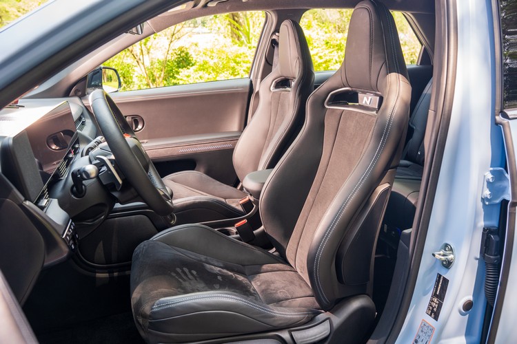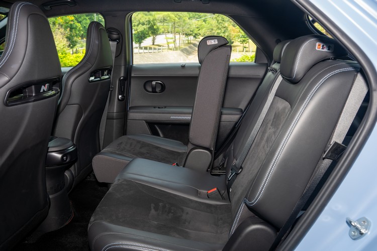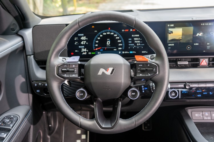 而在車室內,一般傳統性能車會有的升級在IONIQ 5N身上都可以看到,像是340mm盤徑的N專屬多功能方向盤、方格旗造型金屬踏板、輕量化跑車座椅等。中央鞍座上有軟質護膝墊讓你在激烈操駕時膝蓋可以舒適地頂住。與IONIQ 5不同的是為滿足激烈操駕需求中央鞍座為固定式不能前後滑移,中央扶手則還是可以滑移。