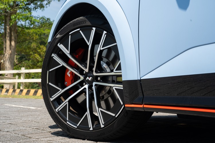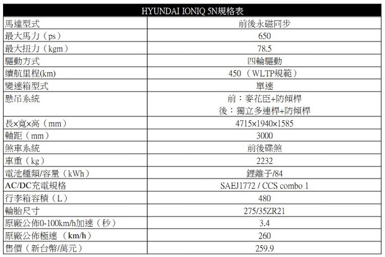 在掛上「N」的logo之下,IONIQ 5N搭載由 N Performance 部門所調校的前、後軸雙馬達四驅系統。在一般情況下可輸出609ps最大馬力,而在按下方向盤上的N Grin Boost 按鈕啟動增壓模式後則可維持10秒鐘最高輸出650p馬力與78.5kgm扭力的強大動能,3.4秒可完成0-100km/h加速,7.8秒可完成0-100mile/h加速,與BMW X6 M Competition水準相當,極速則可達260km/h。 ![]() ▲ 前後軸雙馬達配置,系統最大馬力輸出650ps,最大扭力78.5kgm![]() ▲方向盤撥桿形式的電控換檔介面