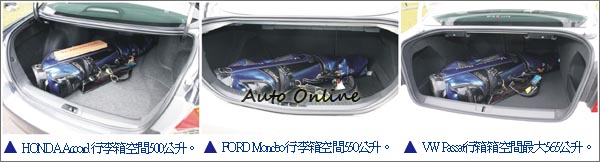 車身尺寸影響車內空間 誰的肚裡能撐船![]() 車身尺寸大小會影響車內乘坐空間,但這也不是絕對,因為有車門門板厚度,座椅椅墊高度多少會影響到車內空間。Mondeo前後輪距跟軸距都是三款車中最大的,但實際試坐之後寬敞度沒有像數據來的亮眼。Accord憑著車身大小的優勢勝出,內裝的寬敞感是Accord車系一貫給人的印象,新世代的Accord軸距放大至2800mm,加上座椅位置降低刻意營造無壓力的乘坐空間,後座乘坐空間寬敞非常適合後座買家,行李箱空間也有大型房車的水準,空間寬敞感為三者之最。