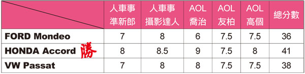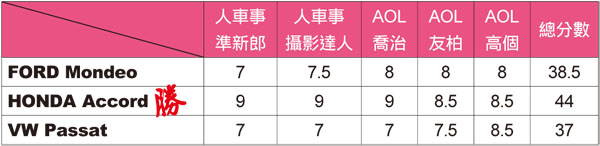 一見鍾情的外觀造型 主觀客觀難拿捏![]() ▲大家一致認為Accord外觀最大氣、氣派,線條比例最大方,相當符合台灣人對車輛外觀造型的喜好。車輛外觀是很主觀的東西,喜歡的人覺得漂亮、不喜歡的人覺得醜,沒有一定的對與錯,這項目中編輯群也是用個人主觀意思來評論三台車外觀,分數供讀者參考之用。這個項目HONDA Accord得到最高分數44分,大家一致認為Accord外觀最大氣、氣派,線條比例最大方,相當符合台灣人對車輛外觀造型的喜好。