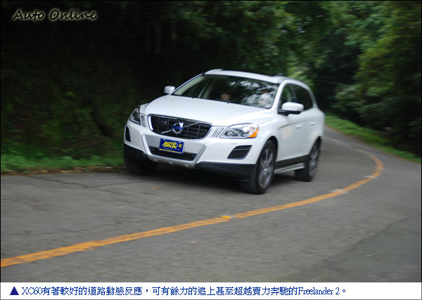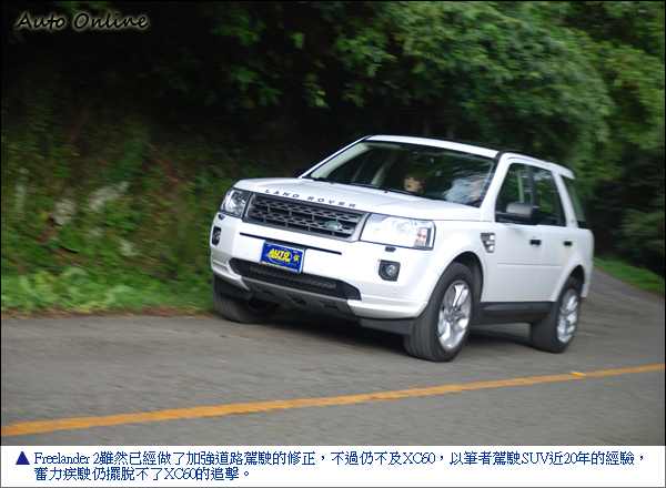 在道路的操控表現上,就換Freelander 2要差上XC60一截了。在此並不是50匹馬力的差異,而是先天底盤懸吊設計理念的差異所致。而XC60擁有敏銳的底盤反應,駕駛可用較Freelander 2還快的車速,處理從底盤回饋起來的操控細節。