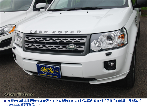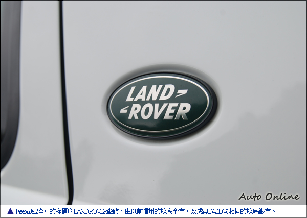 首先全車的橢圓形LAND ROVER徽飾,由以前慣用的綠底金字,改成與D4 SDV6相同的綠底銀字,從徽飾開始一步步提升Freelander 2的時尚氛圍。亮銀色兩幅式蜂網狀水箱護罩,加上全新增加兩側下氣壩和裝有新式霧燈的前保桿,是新年式Freelander 2的特徵之一。