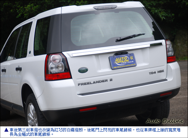 另外,前後燈組也改為黑灰色底框加上透明燈殼的式樣。車後第三剎車燈也改變為紅芯的白霧燈殼,後尾門上閃亮的車尾飾條,也從車牌框上緣的寬度增長為全幅式的車尾飾條,大大提升了Freelander 2的辨識度。