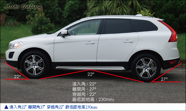 時尚氛圍本就是XC60的強項,結合VOLVO獨到的北歐簡潔設計,使得XC60在4米6的車身尺碼下,仍保有緊實俐落的外觀印象。身為SUV的XC60也擁有22°的進入角、27°的離開角,而2774mm的軸距搭配235/60R18尺碼的輪胎尺寸,也讓XC60維持了22°的穿越角以及230mm的最低距地高度。雖然XC60在越野上的三種角度都略遜Freelander 2,不過在最低距地高上卻也板回了一城。