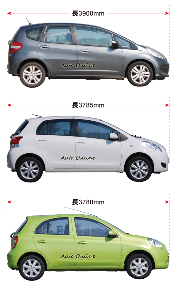 無論是Fit (3,900mm)、Yaris(3785mm)或是March(3780mm)三者的車身長度都未超過四米,三者的訴求其實都差不多,希望藉由短車身的設計方便在狹窄的巷弄間穿梭,主打都會通勤需求。