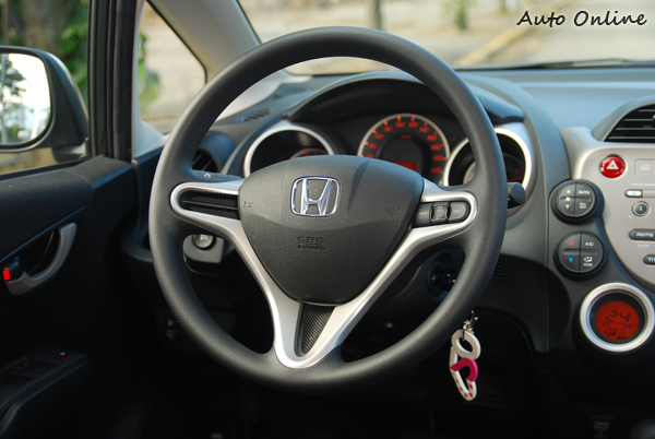 而HONDA FIT整體中控台面板呈現的是一種比較運動的風格。雖然旋鈕部分同樣以圓形為主,但面板上還是保留傳統的按鍵。此外方向盤也不走可愛模樣,呈現出較為動感跑格的意象。