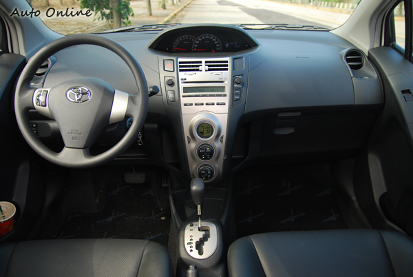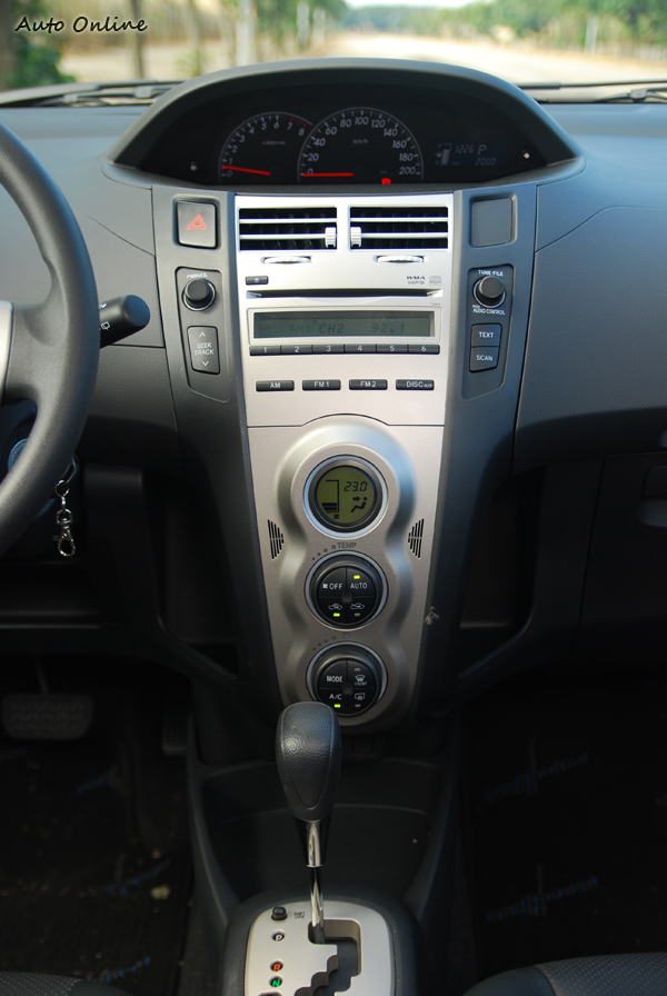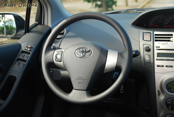 Yaris在內裝陳設上與March較為類似,無論是旋鈕或是視窗都是圓滾滾的模樣。但畢竟Yaris推出有一段時間了,長條型的中控台就現在的標準來看是有些單調,不過依舊屬於水準內的設計。