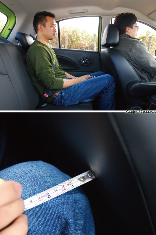 最後一個檢驗的是軸距最短的March(2,440mm)。在上期的試駕當中我們明白知道現行的K13在外觀上與K11相比有顯著的變高變胖!不過當比例尺先生一入座後居然膝蓋竟直接頂到前座椅背了。一開始我還以為是同事在鬧,還叫他趕快坐好,但阿啾用他雖小但真誠的眼睛跟我說他真的坐好了。但如同教育工作者都不願在考卷上打上0分的道理一樣,我們硬擠之下來還是勉強在膝蓋部分測出5mm的空間。不過若你有後座乘坐成人的需求,那麼親自到展間試乘March感受一下其後座空間我想是有必要的。