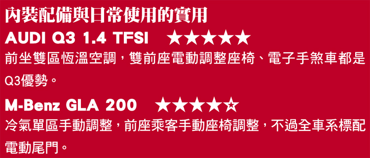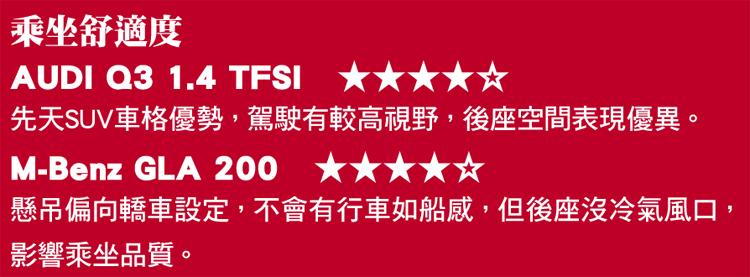 反觀M-Benz GLA外型有走跨界休旅設定,所以車身高度沒有Q3來的高,駕駛者視野趨近轎車感受,懸吊部分比起Q3來的硬朗,加速力道承襲賓士一貫線性作風,GLA承襲轎車該有的乘坐感受。後座座椅角度比對手傾斜,頭枕位置也符合人體工學,但GLA唯一缺點後座沒有冷氣出風口;膝部空間沒有Q3充裕,頭部空間兩者差不多,後座中間有中央扶手附置杯架。如果你是習慣轎車乘坐感受,但又想要有SUV大空間,GLA無庸置疑會是首選。